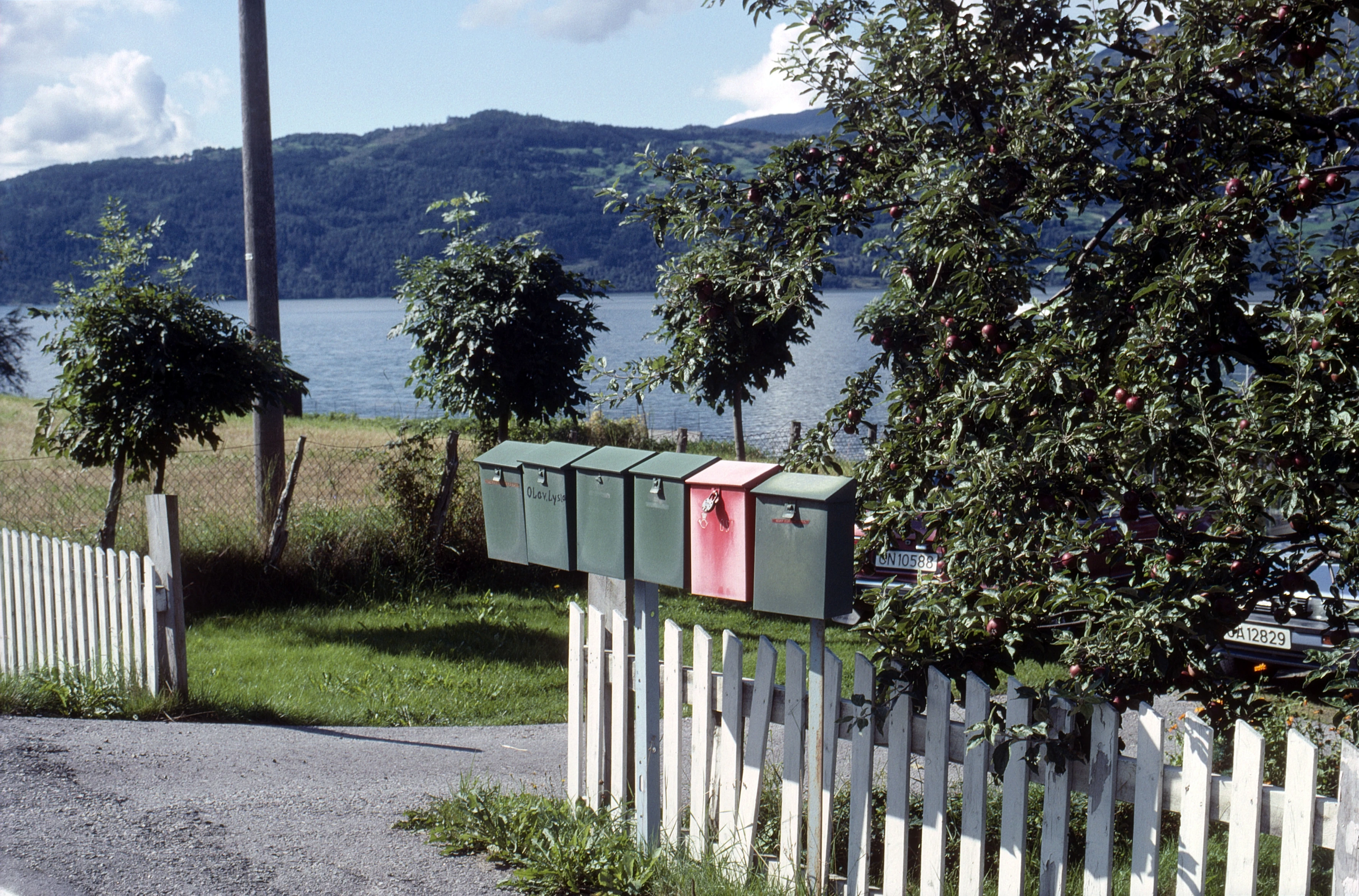 Typical Norwegian mailboxes, probably at Innvik, hanging on a garden fence.