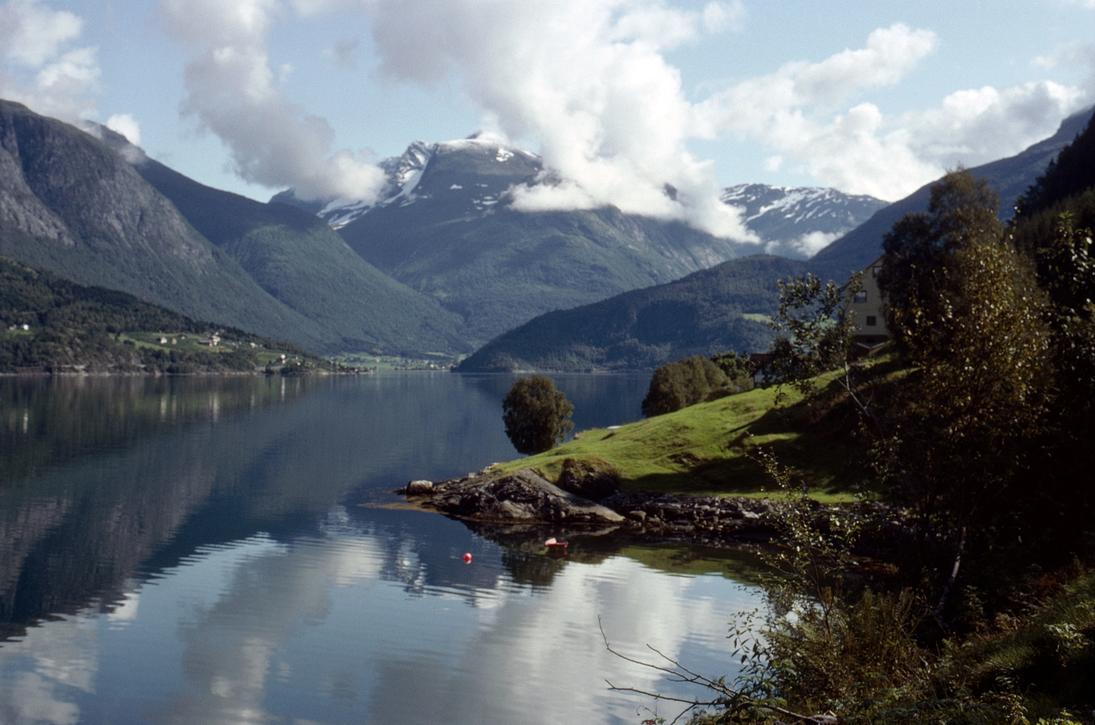 Back towards Loen over Nordfjord from near Vangberg, the fjord mirror-calm.