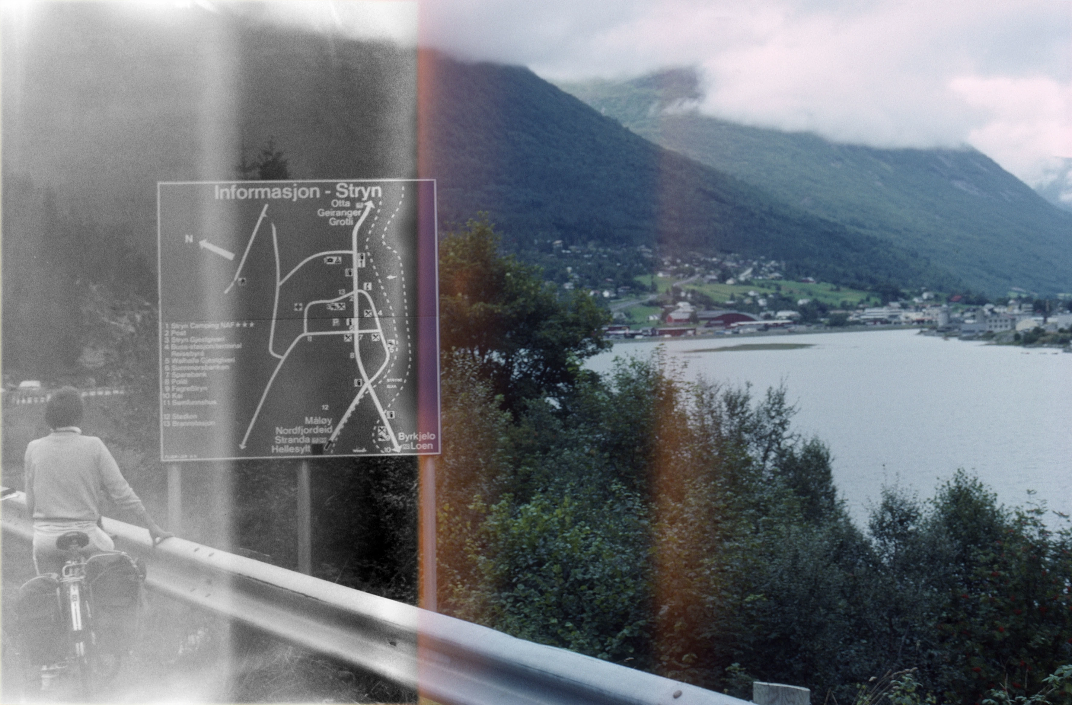 Pausing at the Stryn information sign on the Rv 15 approach (film damage).
