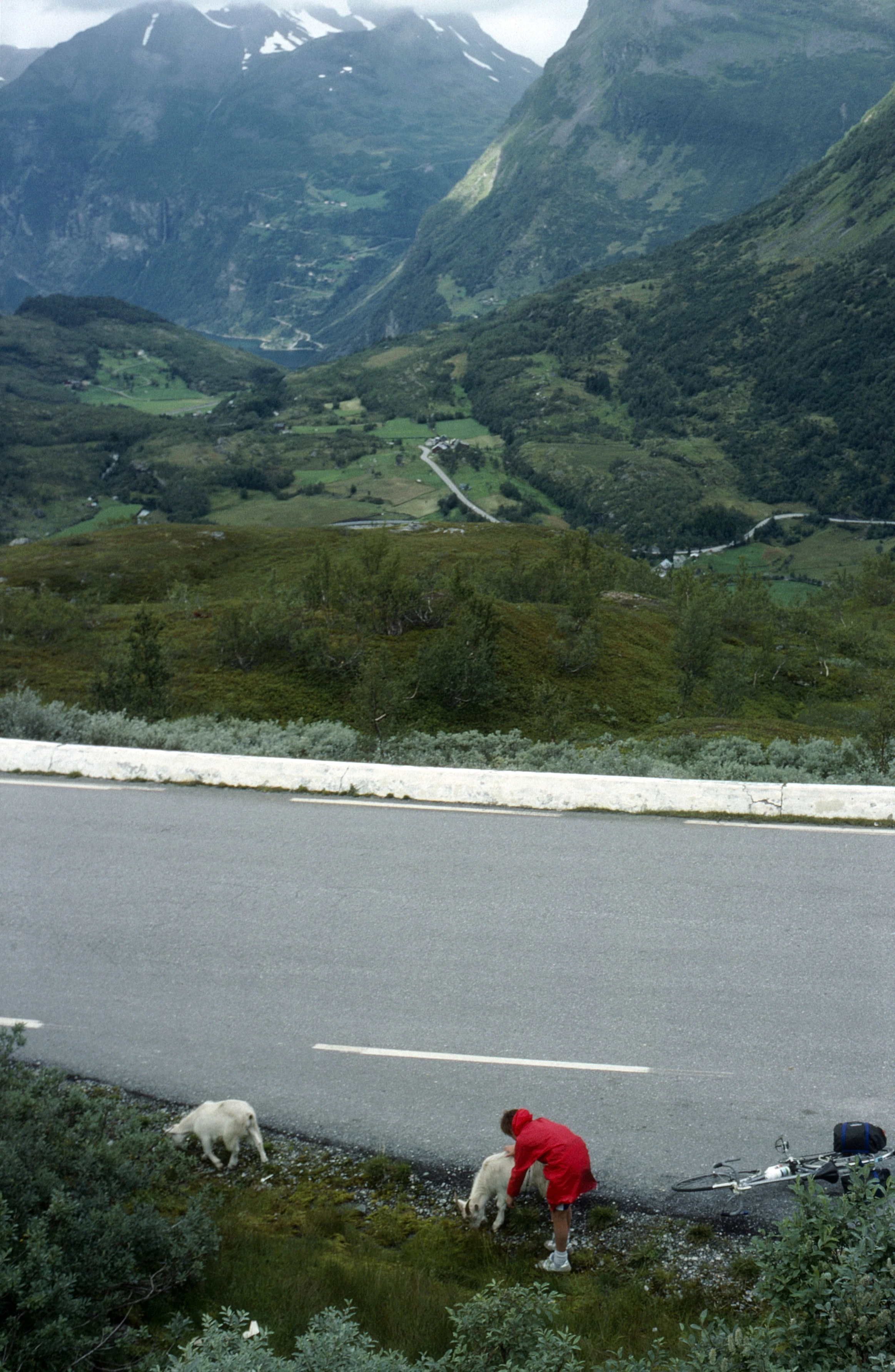 Shane meets some very friendly Norwegian dairy goats on the hairpin descent to Geiranger.