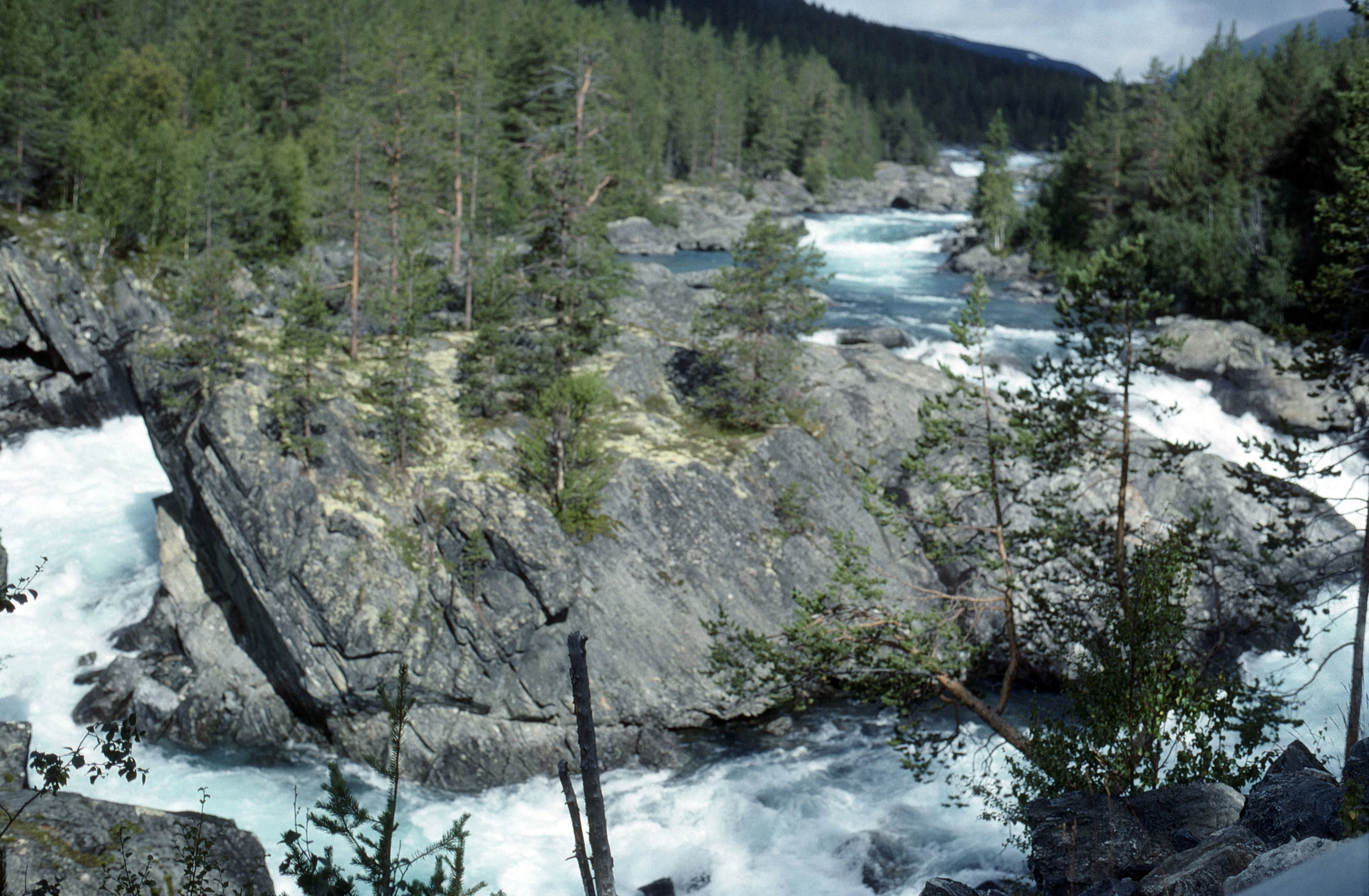 The fast-flowing river Framruste from the road between Polfoss and Vuluvatnet.