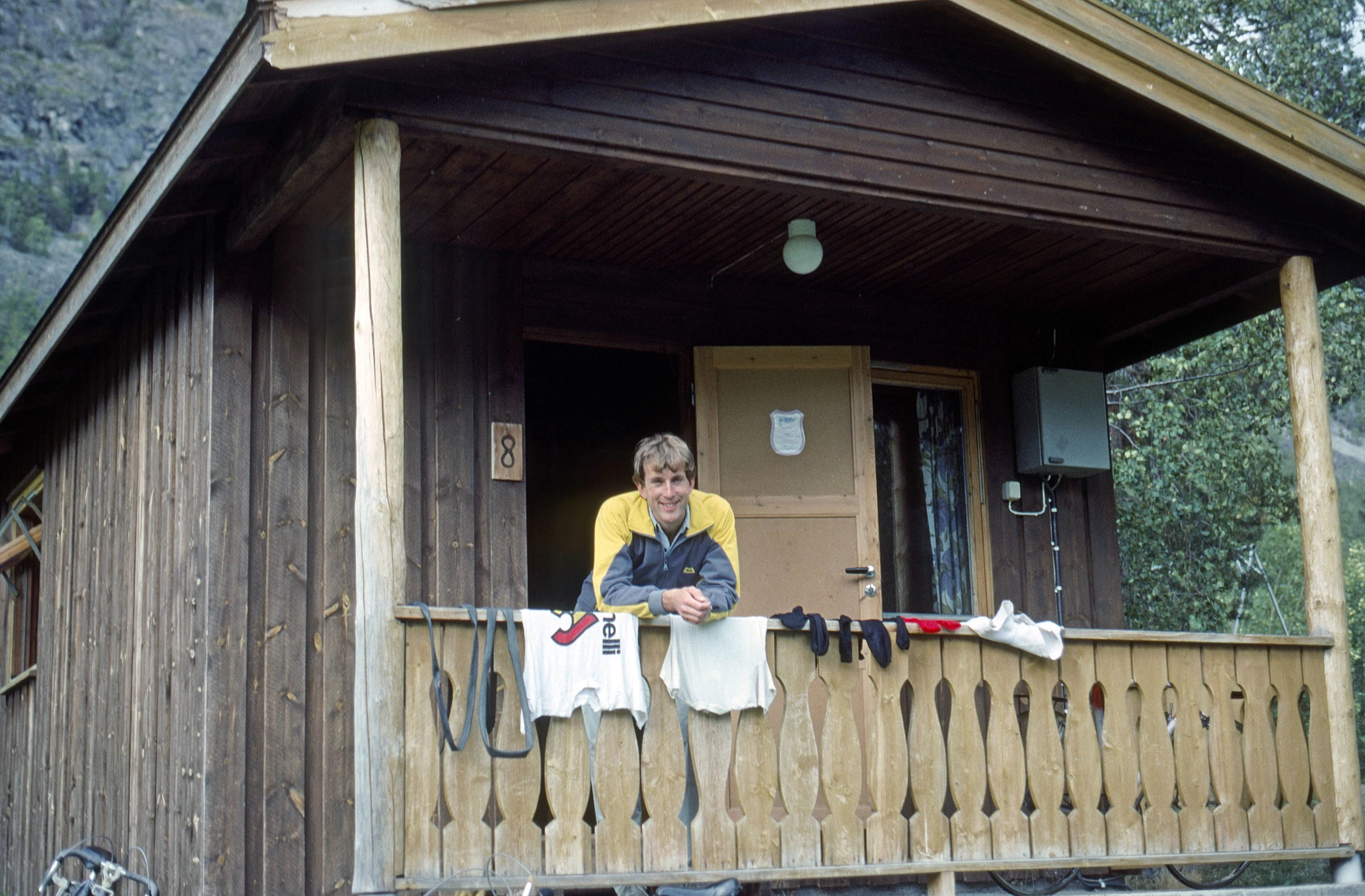 Michael on the balcony of Chalet 8, Skjåk youth hostel, Mogard, Bismo.