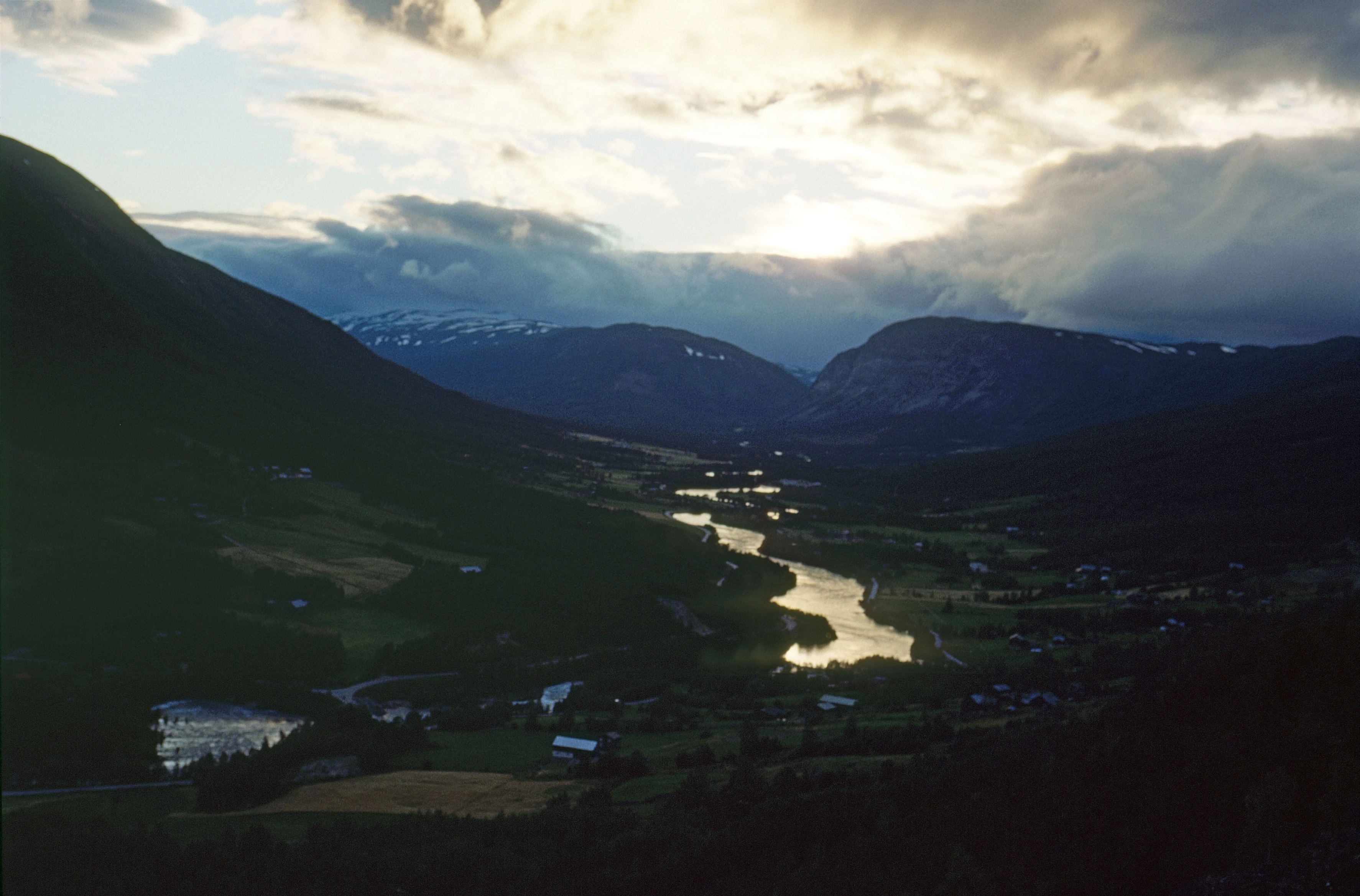 Otta valley from the hillside behind Skjåk youth hostel; sunset glinting off the river.