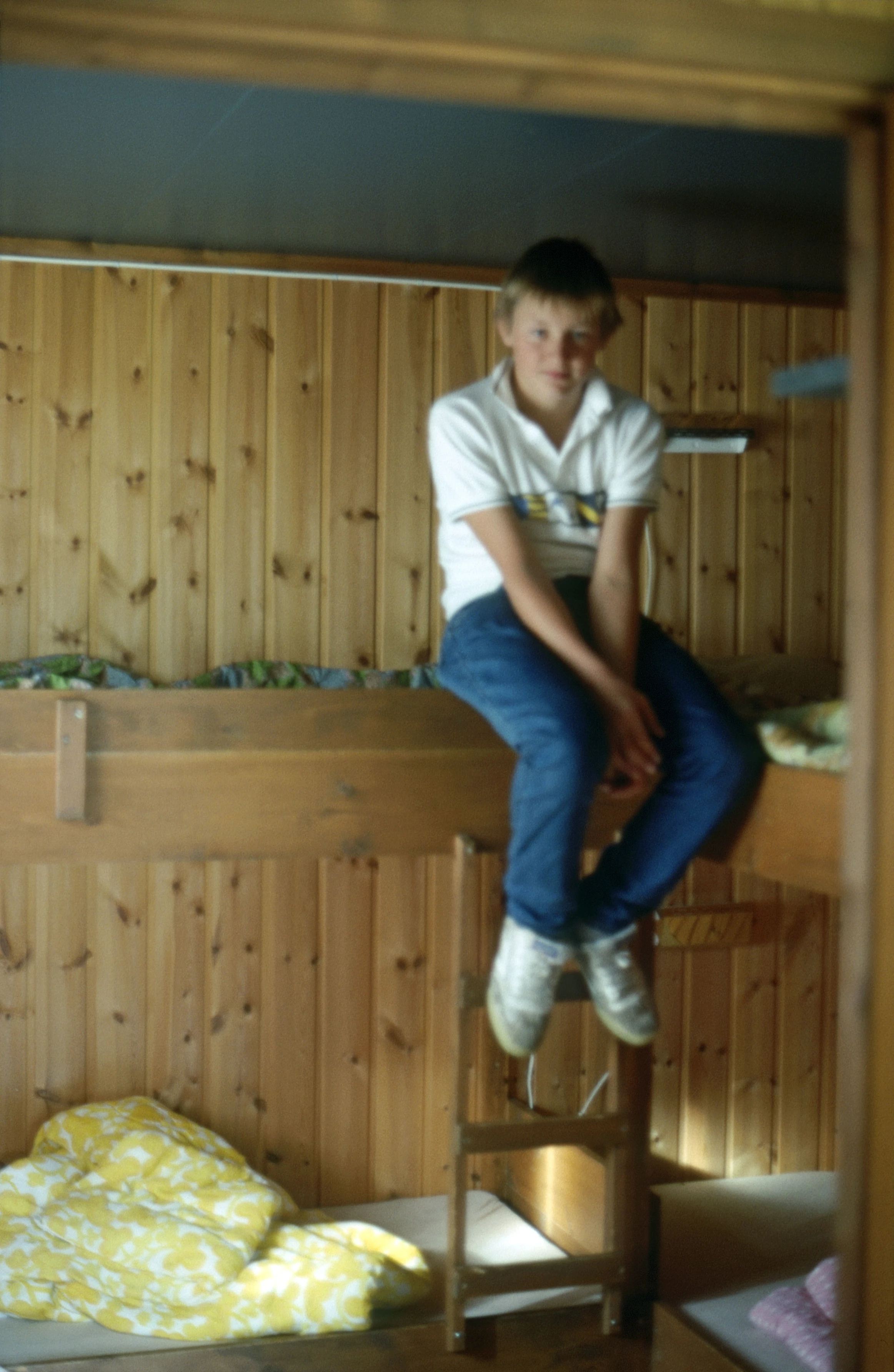 Shane demonstrating the comfy wooden corner bunks in our Skjåk youth hostel chalet.