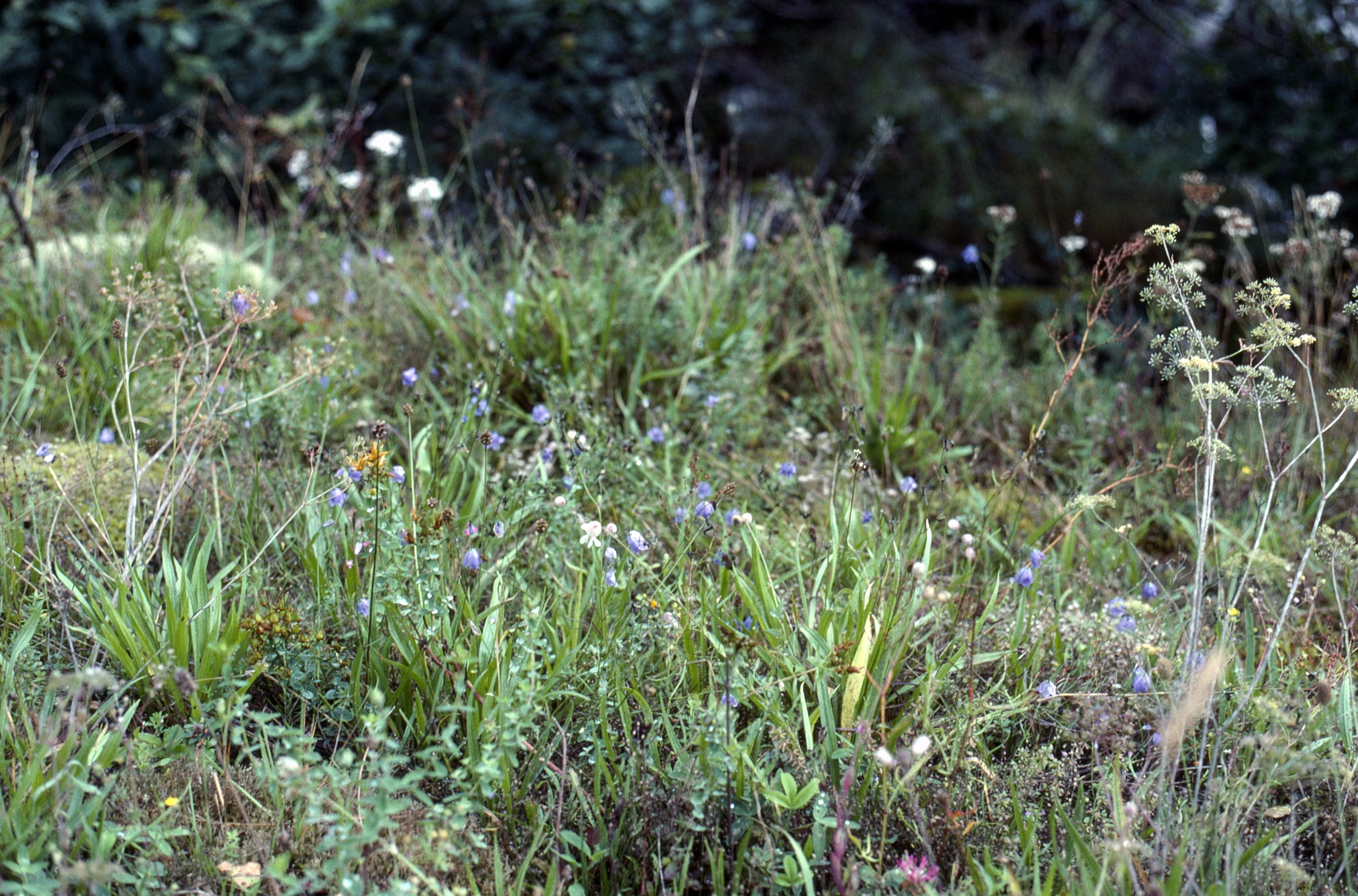 Roadside wildflowers by Lustrafjord: harebell, self-heal, yellow-rattle, ribwort plantain, white clover, umbellifers.