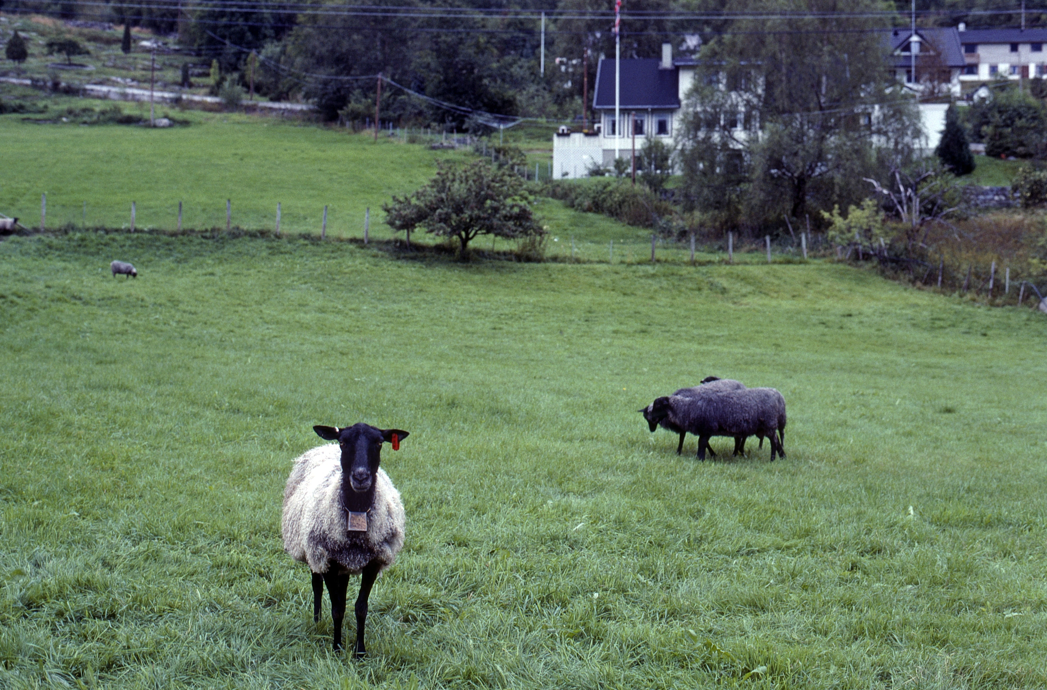 Norwegian sheep with bells, fields above Lustrafjord at Høyheimsvik.