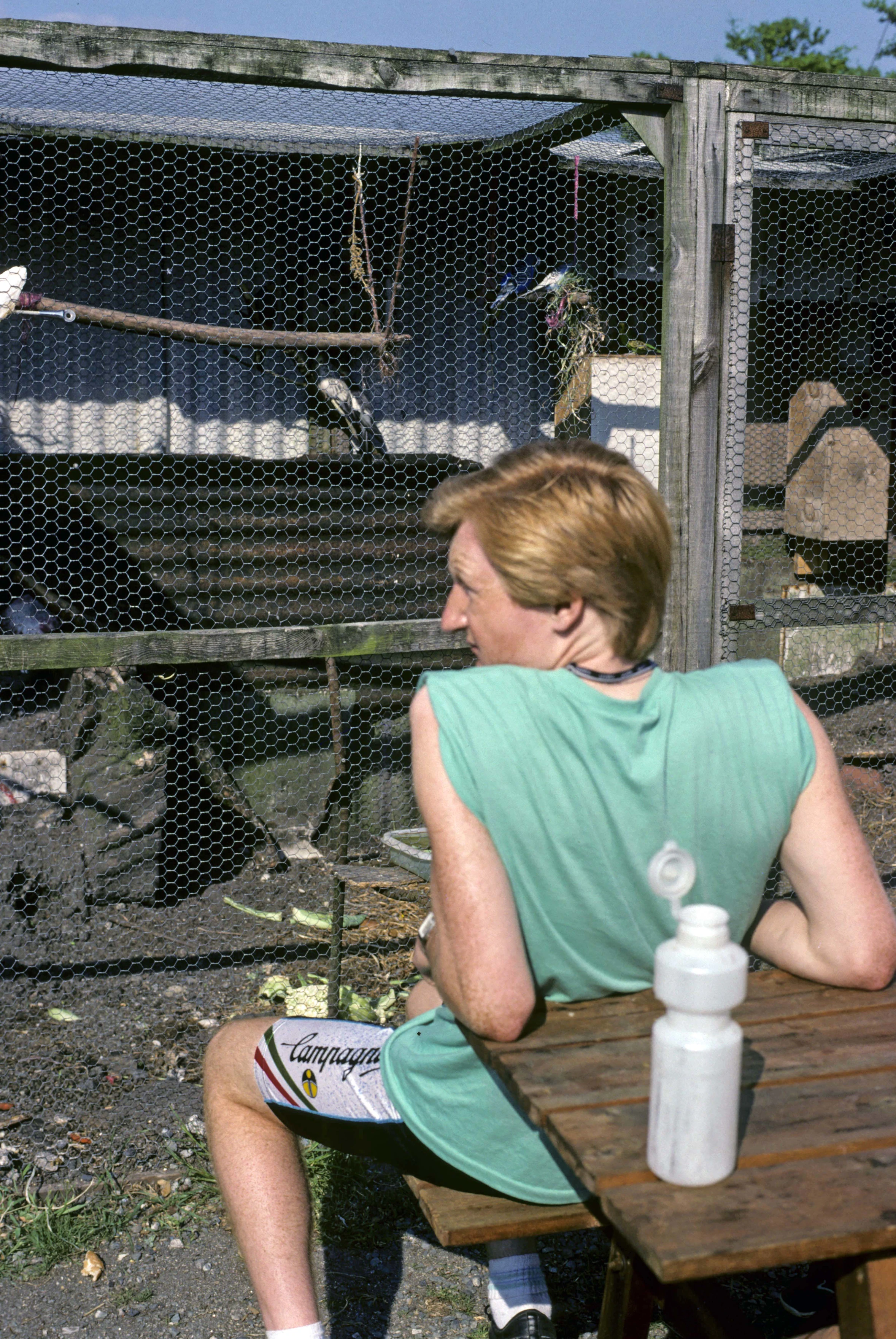Richard 'Budgie' Burge greeting his relatives in the aviary behind the Foxtor Café.