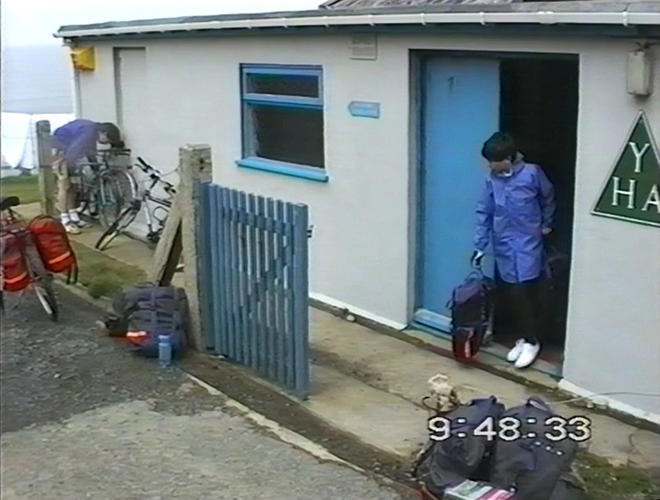 Clyde hauls panniers to his bike at Perranporth Youth Hostel.