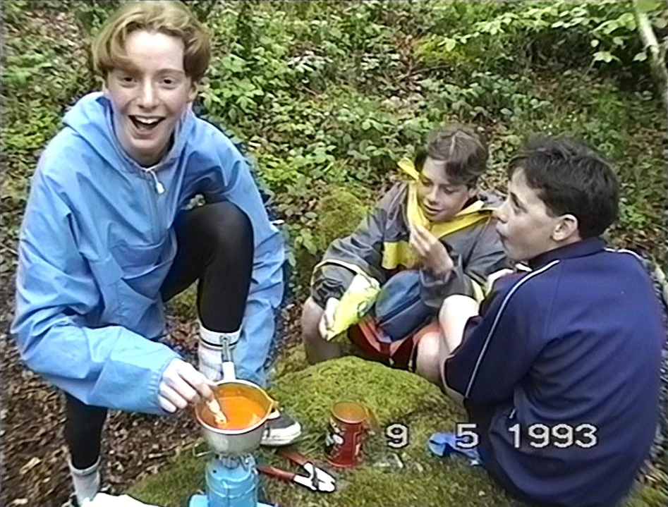 Tom stirs soup with an improvised 'stirring rod', watched by Eliot and Gavin.