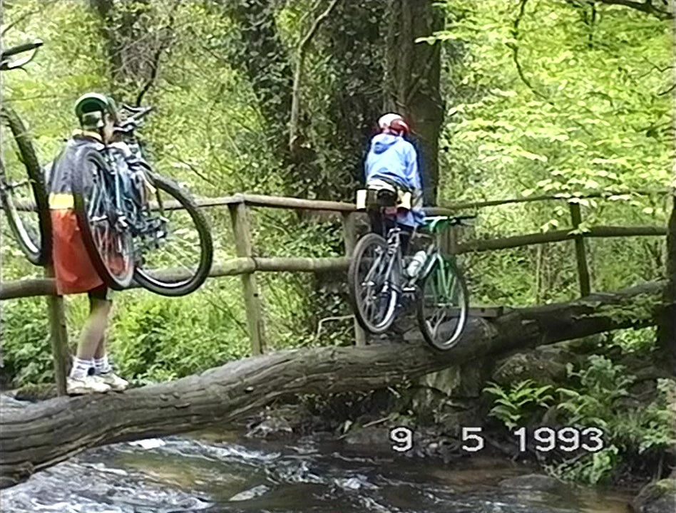 A precarious crossing of the River Bovey footbridge to Houndtor Wood.