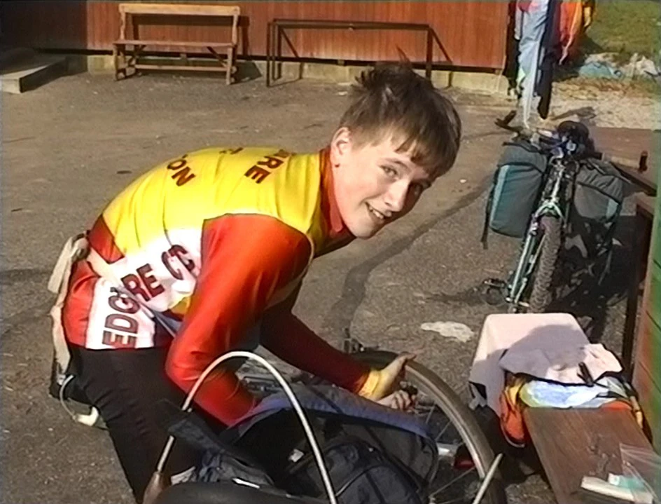 Jered pumps up his tyre after fixing last night’s puncture.