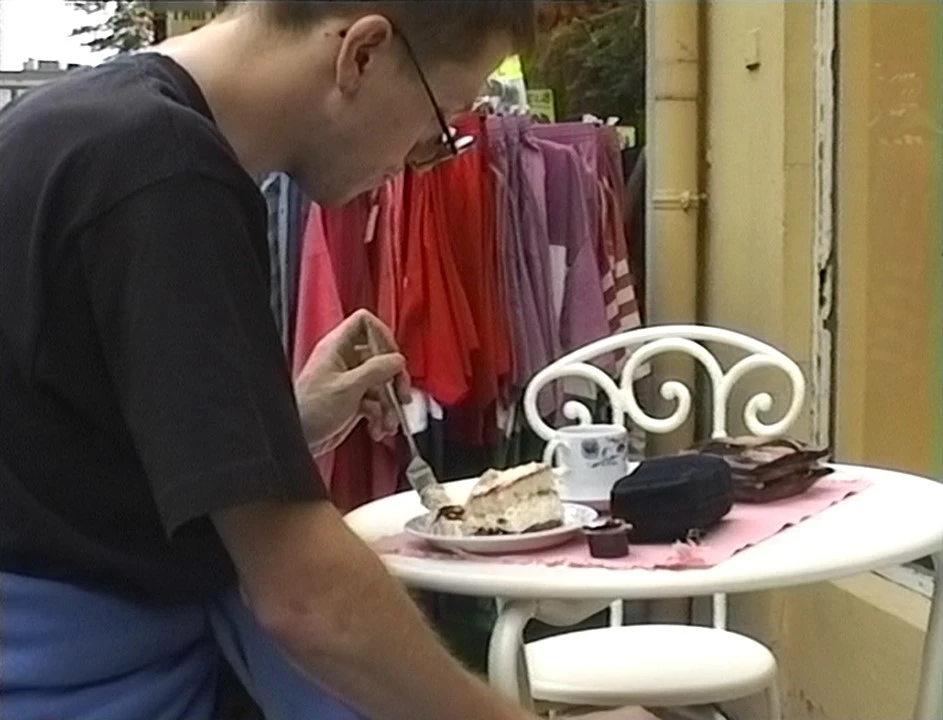 Julian savours excellent cake outside the café at 18 Kaigaten, Bergen.