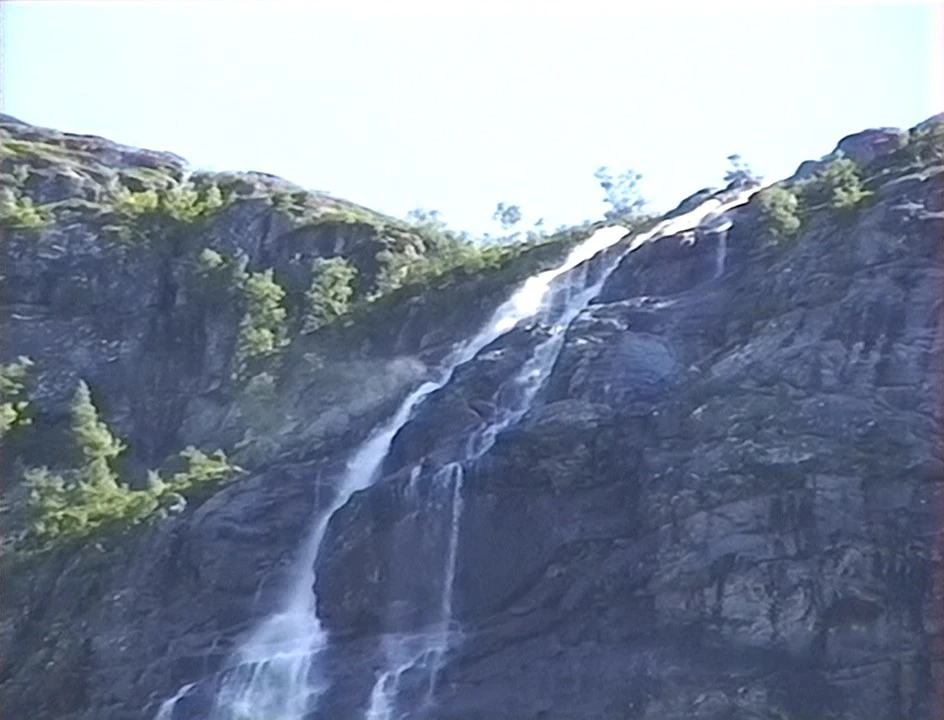 A waterfall cascades off the mountainside near Klakegg, 7.6 miles from Byrkjelo.