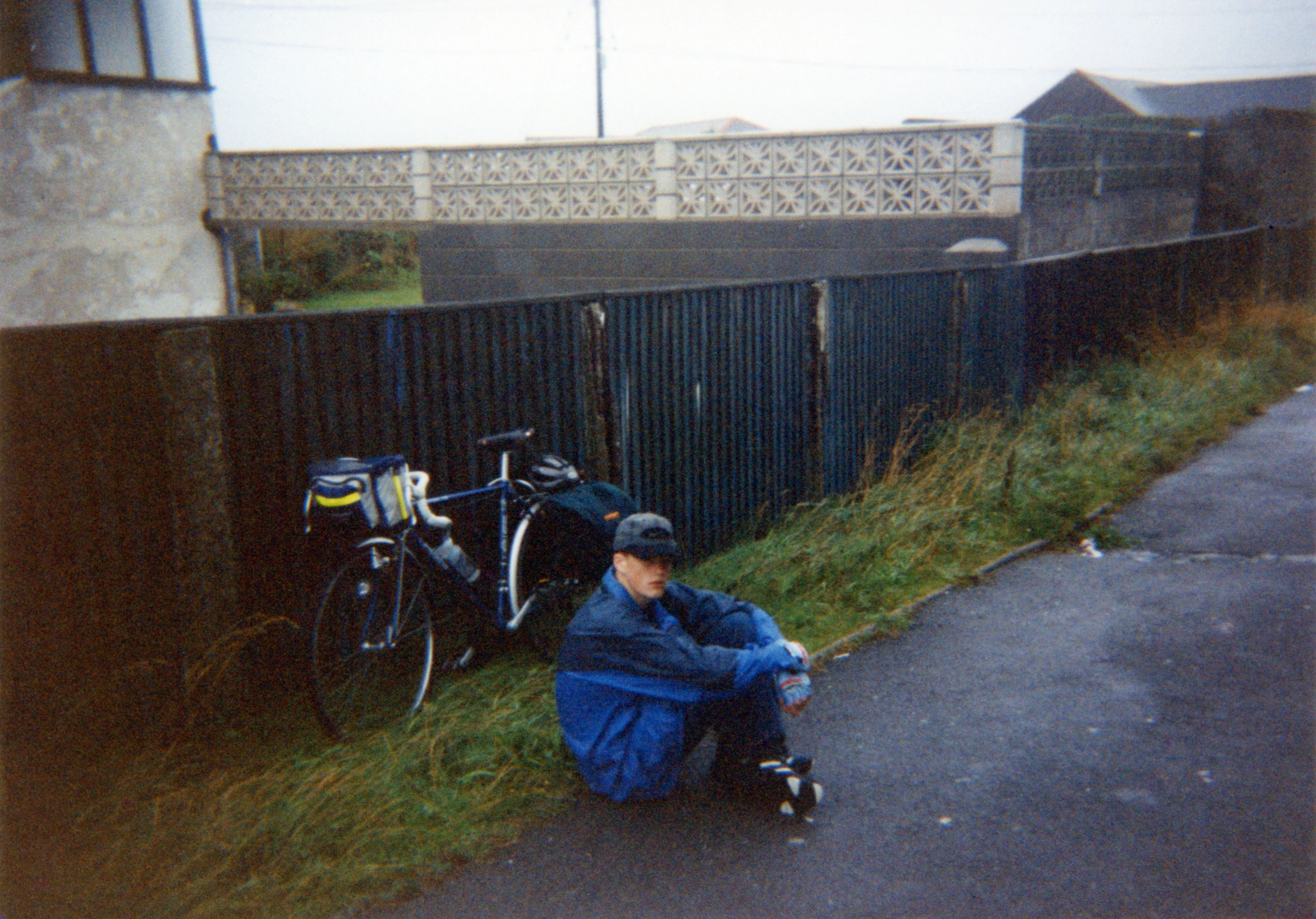 Fergus, wet and decidedly miserable, outside Borth Youth Hostel.