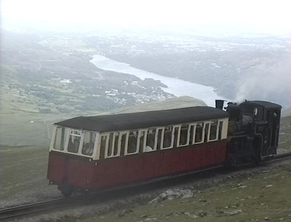 Snowdon Mountain Railway steam train chugs up to the summit station
