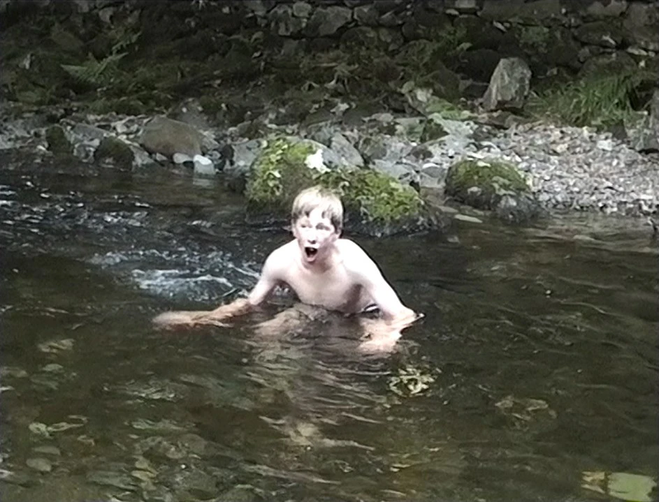 Ryan takes the plunge in the icy River Gwynant at Kings youth hostel