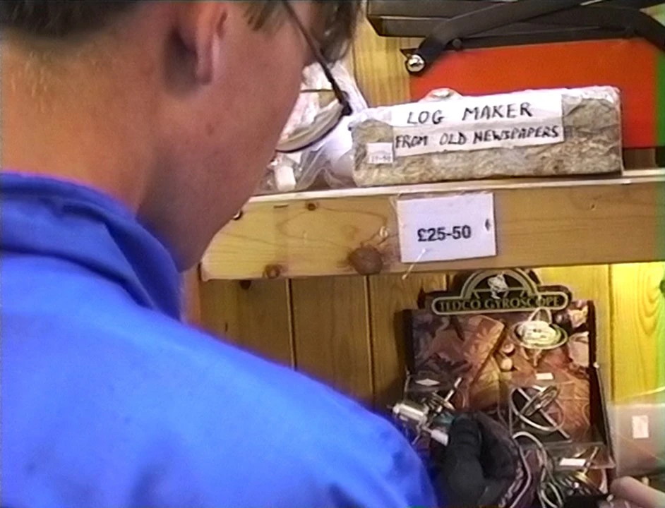 Oliver checks out a solar panel in the Centre for Alternative Technology shop, Machynlleth.