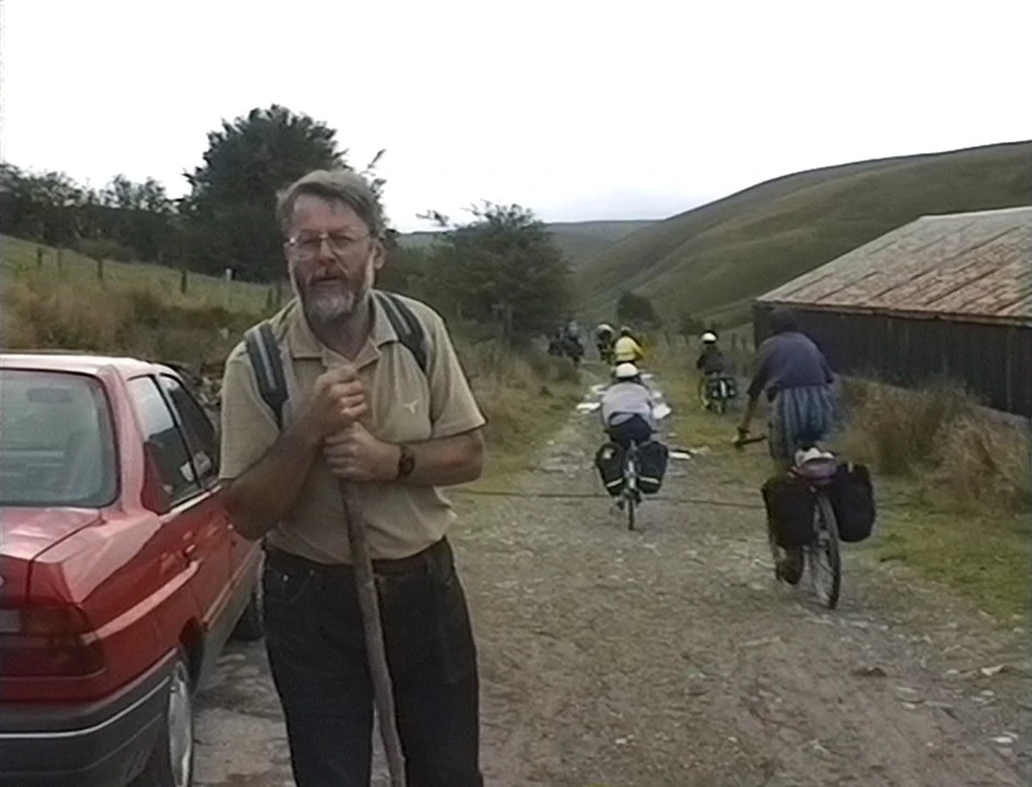 Roger chats with Michael as we start the 2.4‑mile track shortcut from Tyncornel youth hostel.