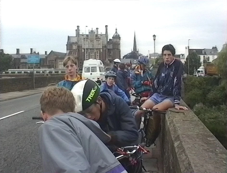 The group on Wye Bridge, Monmouth, with Monmouth School behind.
