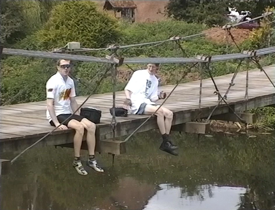 Julian and John lunch on the suspension bridge at Ham, Creech St Michael (4.5 miles in).