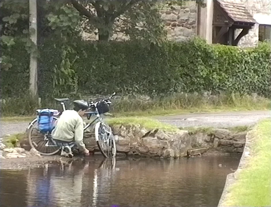 James gives his bike a duck-pond wash at East Quantoxhead.