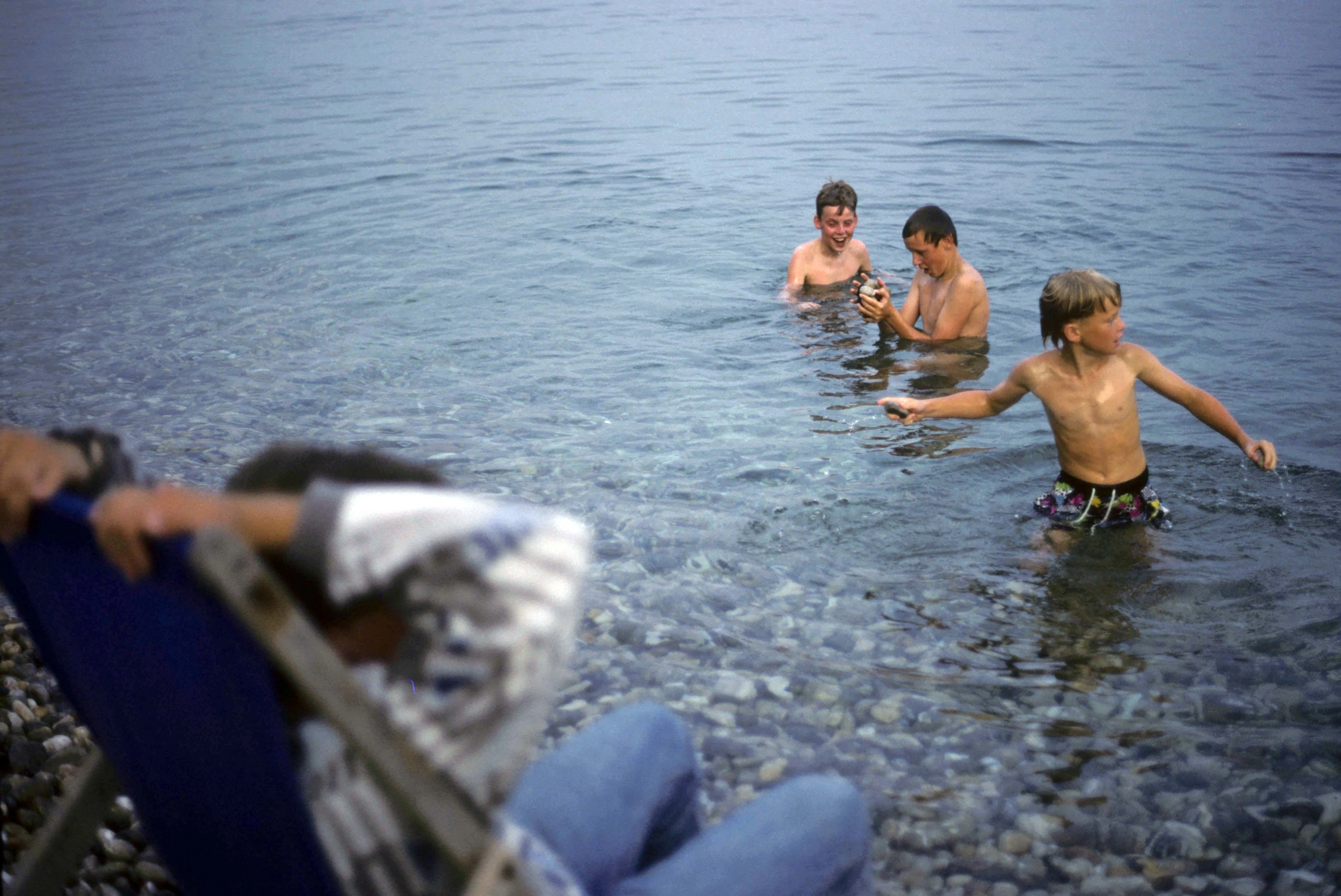 Philip Humphreys (?), Shane Powell and Toby Hopper enjoy the sea at Beer beach.