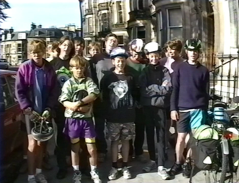 The whole group sing Happy Birthday to Michael outside Edinburgh Eglinton Youth Hostel.