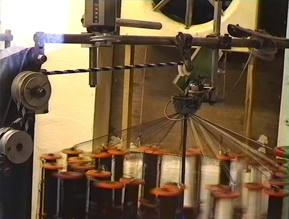 Ingenious ropemaking machine at The Ropemakers, Hawes, weaving multicoloured cords into one rope.