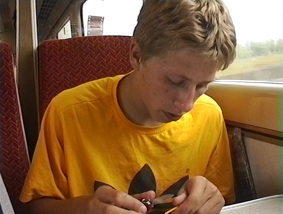 Ryan sharpens a straw with his penknife on the train from Carlisle to Newton Abbot.